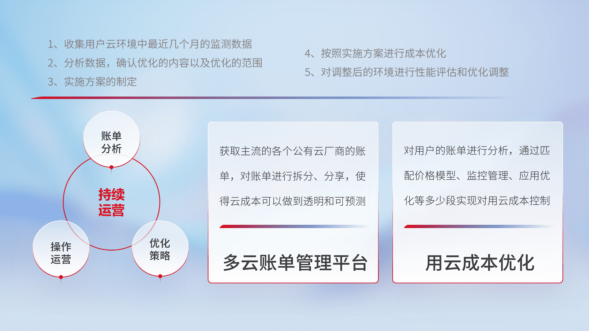 通过多云纳管,,,以统一的资源数据模型把客户的云资源进行抽象和封装,,,进而实现对多云资源的统一操作,,保障云资源管理的可靠性、、、、稳定性与可用性。。。量身定制化运维内容,,,配置、、开发运维、、、、补丁管理、、备份、、、监控、、、、认证和访问管理、、、、审计和日常巡检等,,保障在用云过程中的可靠度,,,,稳定度以及高可用率。。